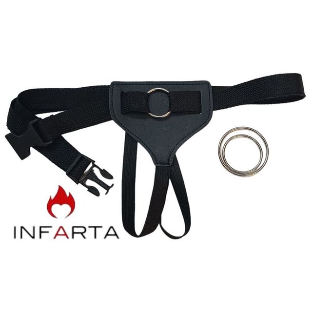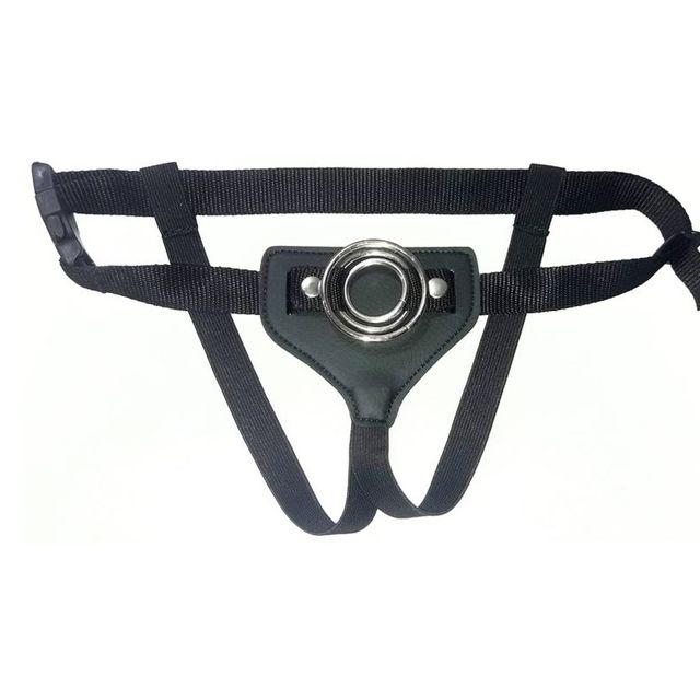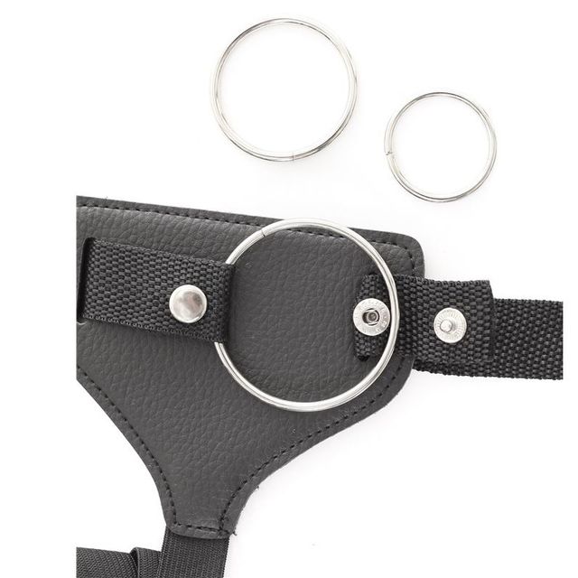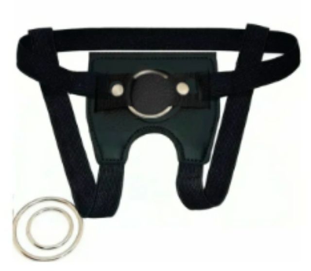 Arnes ajustable con tres anillos de diferentes tamaños para usar con distintos dildos dependiendo de sus medidas.
